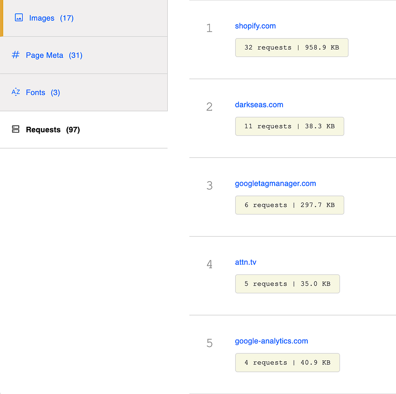 How do we know if this is happening? An easy way to find out what is loading on our page is to test with Page Doctor and look at the Requests tab — which will show the number of requests by origin domain.